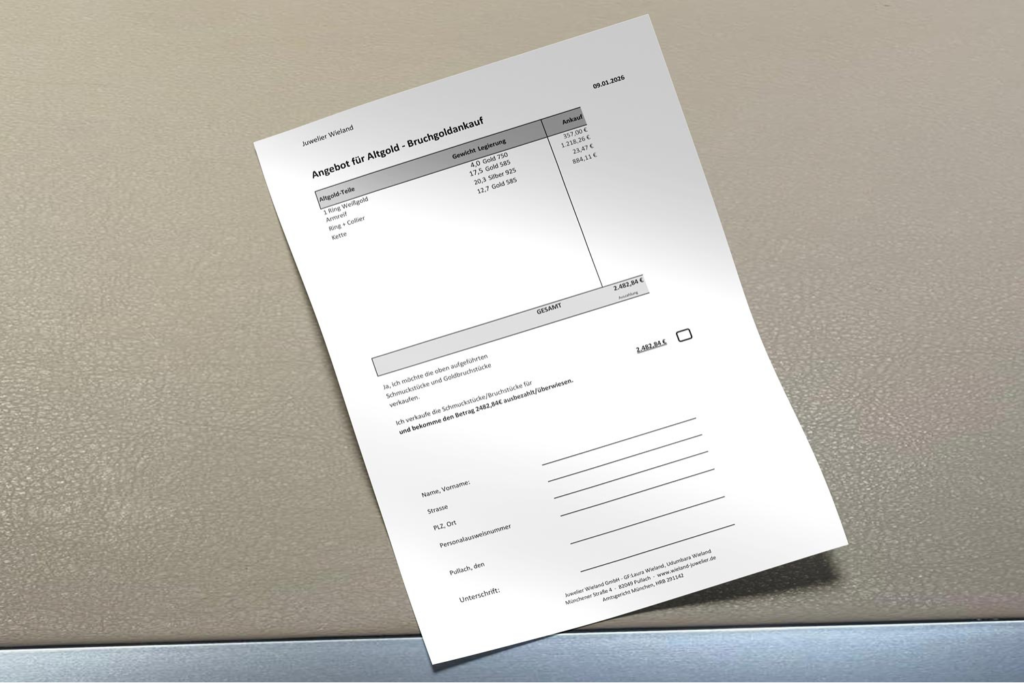 Ob Schmuck, Münzen, Barren oder Erbstücke – bei Juwelier Wieland in München bewerten wir Ihr Altgold mit schonender Prüftechnik, ermitteln den Wert transparent zum tagesaktuellen Goldpreis und zahlen Sie sofort in Bar oder Echtzeit-Überweisung aus.