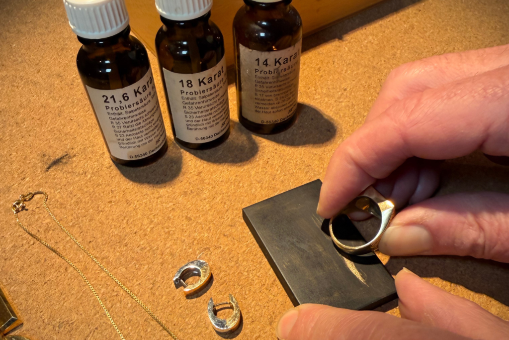 Mit moderner Prüfsäure-Analyse bestimmen wir den Feingehalt Ihres Schmucks – schonend, zuverlässig & transparent