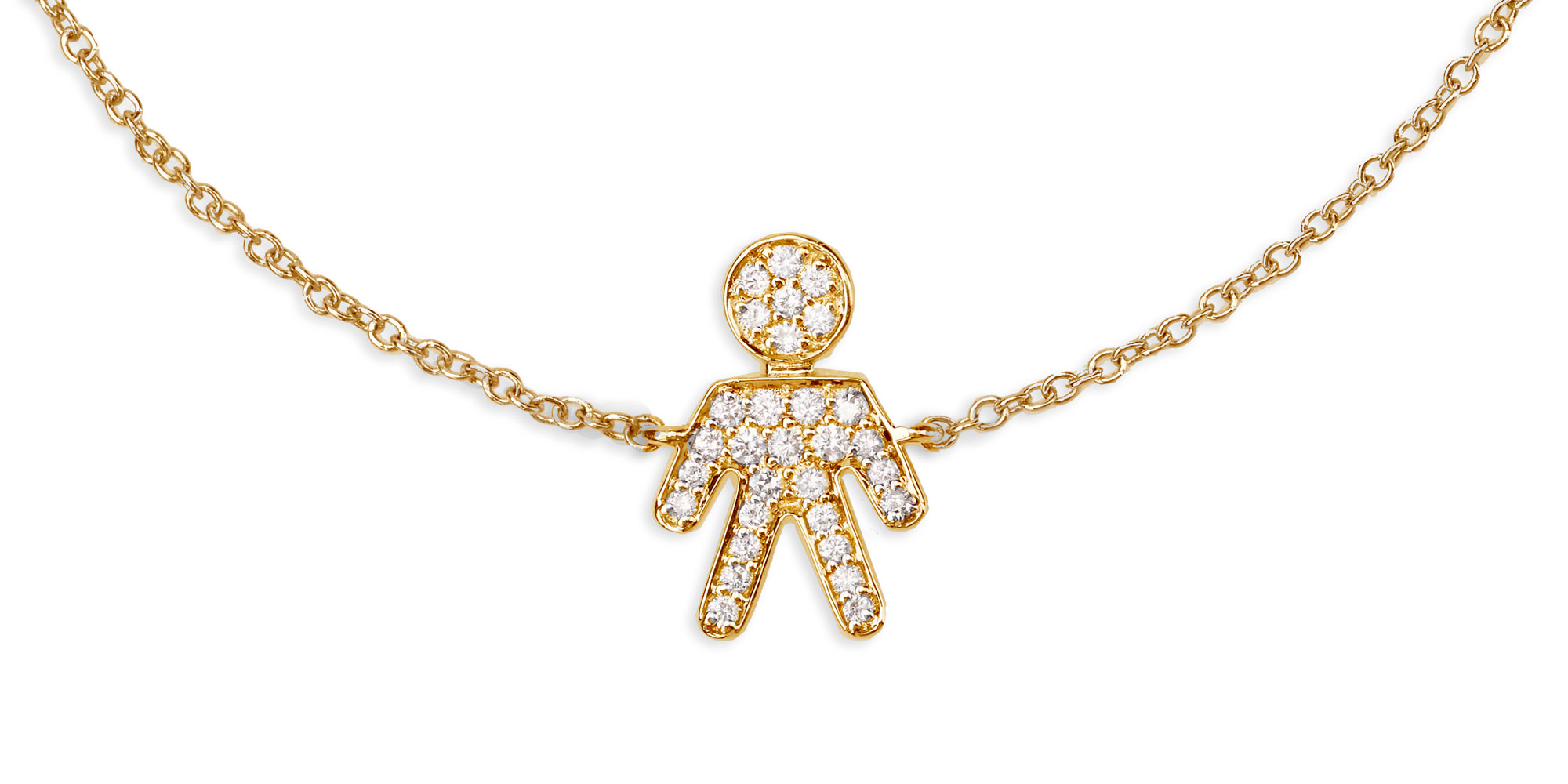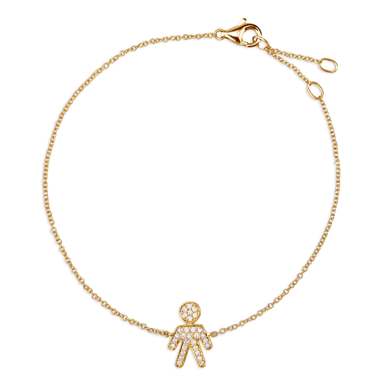 Feines Armband aus Gelbgold 750 mit Ankerkette und Karabiner-Verschluss. Länge 18 cm, zusätzlich eine Zwischenöse bei 17 cm für optimale Anpassung. Besetzt mit 30 Brillanten (Gesamtgewicht 0,11 ct, Farbe G, Reinheit SI). Oberfläche poliert, Motiv: Boy. Referenz KB89090Y. Ideal für Alltag und besondere Anlässe durch seine dezente, dennoch funkelnde Ausstrahlung.