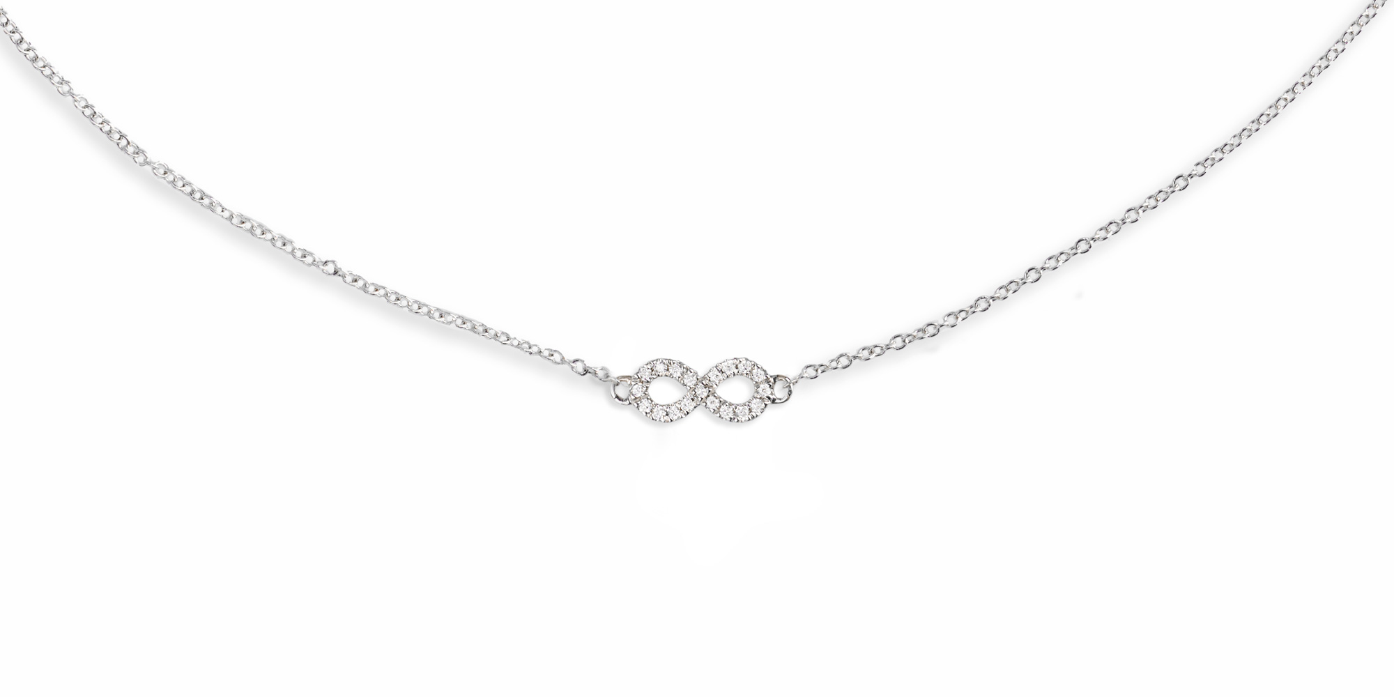 Diese elegante Infinity-Halskette verbindet zeitlose Symbolik mit feinem Diamantbesatz. Das schlanke Design wirkt zurückhaltend und doch ausdrucksvoll – ideal für den täglichen Gebrauch und besondere Anlässe.