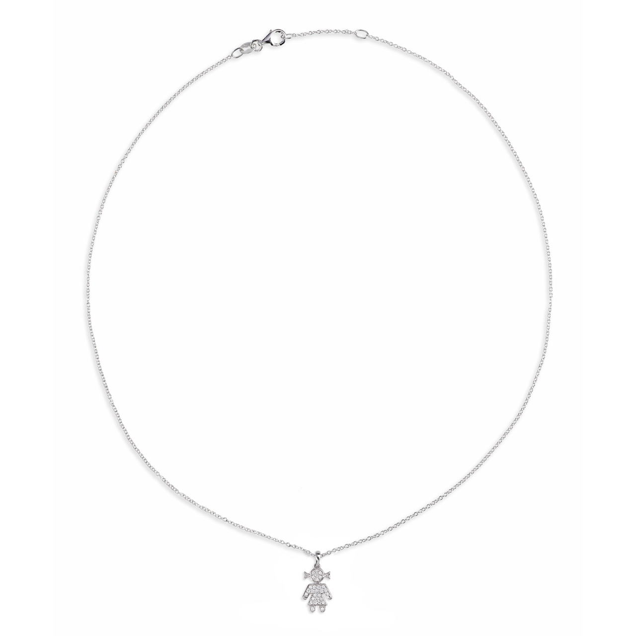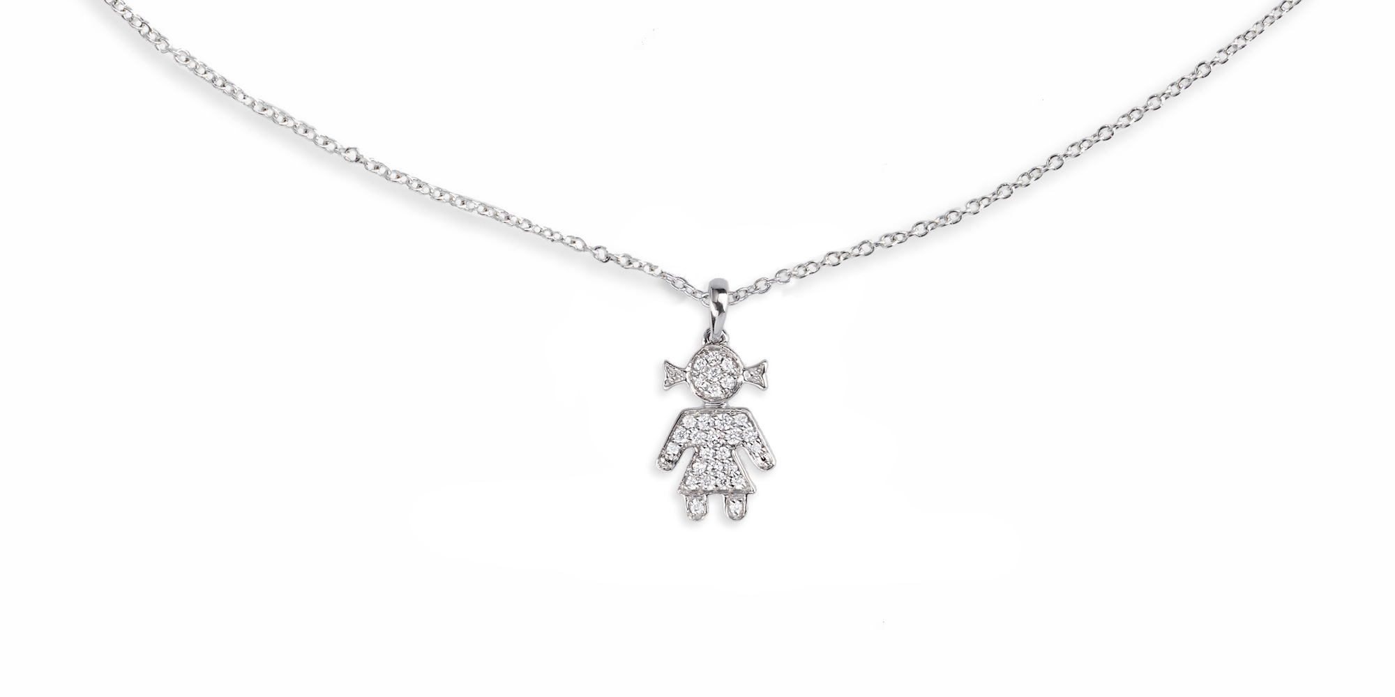 Die Halskette aus Weißgold 750 besticht durch einen zierlichen Girl-Anhänger, besetzt mit 29 Brillanten (insgesamt 0,11 ct, G SI). Die polierte Oberfläche und die feine Ankerkette unterstreichen die filigrane Optik. Länge 45 cm mit einer Zwischenöse bei 42 cm, sicher verschlossen durch einen Karabinerverschluss.